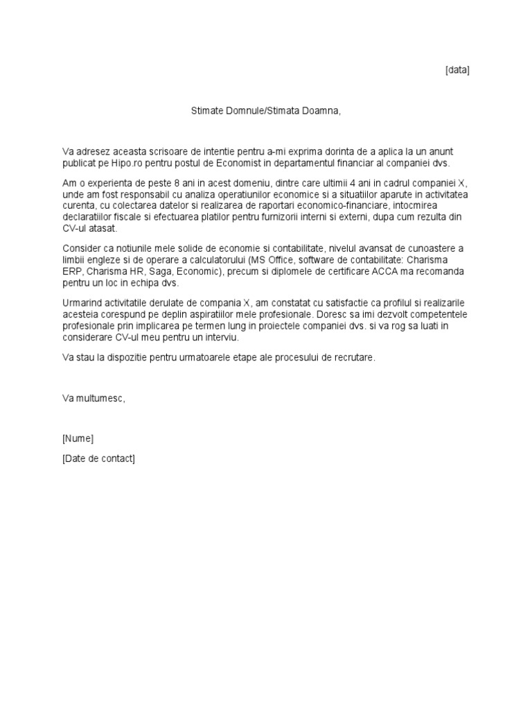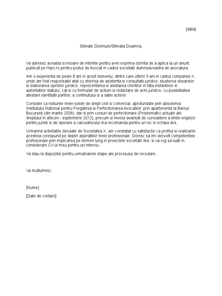 Save MODEL DE SCRISOARE DE INTENTIE For Later. Va adresez aceasta scrisoare de intentie pentru a-mi exprima dorinta de a aplica la un anunt publicat pe Hiporo pentru postul de. Data Stimate DomnuleStimata Doamna Va adresez aceasta scrisoare de intentie pentru a-mi exprima dorinta de a aplica la un anunt publicat pe Hiporo pentru postul de Avocat in cadrul societatii dumneavoastra de avocatura.