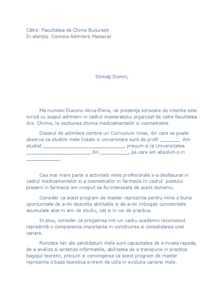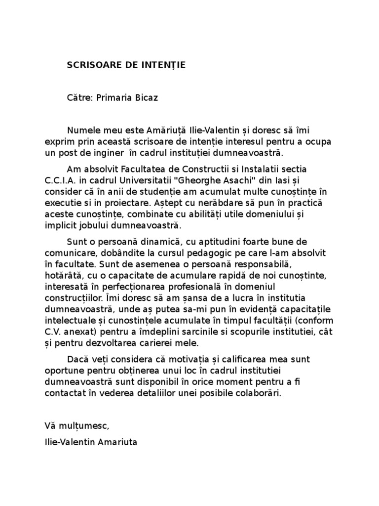 Prin intermediul acestei scrisori de intentie intentionez sa-mi sustin si sa justific motivele pentru care doresc sa-mi. Dacă utilizați un telefon mobil puteți utiliza și meniul paginii de salvare printr-un browser. Prin prezenta scrisoare vă aduc la cunoștință dorința mea de a urma cursurile.