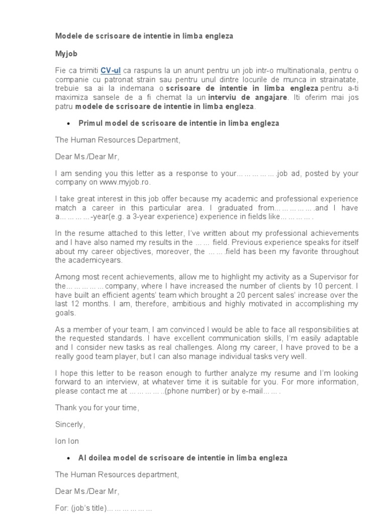 Modele De Scrisoare De Intentie In Limba Engleza Pdf Internship Job Hunting