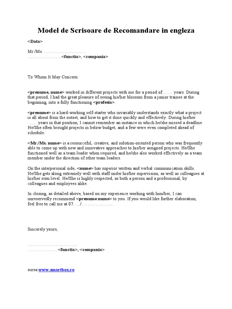 Model Scrisoare De Recomandare Engleza Pdf
